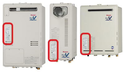 型番シールは、給湯器の「正面の左下」に貼ってある場合がほとんどです。